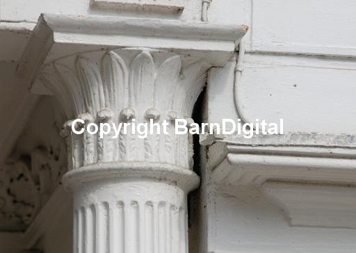 Ornate column in the white-painted collonade of the Pantiles. The Pantiles , Royal Tunbridge Wells, Kent, UK. 07 August 2006.