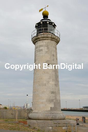 The now disused lighthouse at Kingston Beach, Shoreham. This lighthouse, built from stone blocks, has a roof ornamented with dolphins and scallop shells with a red sphere and wind vane on the top. Shoreham, Sussex, UK. 08 August 2006.