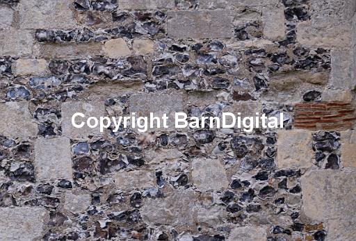 The walls of St Mary's Church are made of many different materials: Stone blocks, local sandstone, flints and even roman bricks and tiles. Chilham, Kent. 10 August 2006.