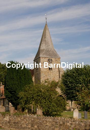 St Bartholomew's parish church, Burwash, has a tower dating from the twelfth century. Lime (Tilia vulgaris) and Yew (Taxa baccata) trees grow in the graveyard. Burwash, Sussex, UK. 15 August 2006.
