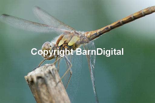 Female Comon Darter dragonfly (Sympetrum striolatum) rests on a stick. Bedgebury Forest, Kent, UK. 19 August 2006.
