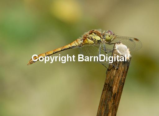 Female Comon Darter dragonfly (Sympetrum striolatum) rests on a stick. Bedgebury Forest, Kent, UK. 19 August 2006.