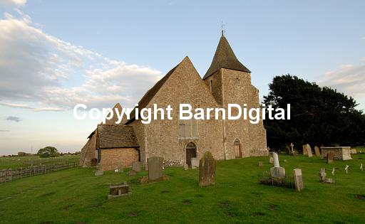St Clements Church, Old Romney. The twelfth century church, like many on Romney Marsh, is built on a slight mound to protect it from flood water. There is an ancient yew tree (Taxus baccata) in the graveyard. Old Romney, Kent, UK. 21 August 2006.