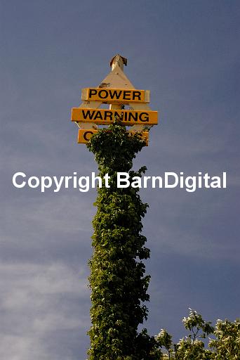 Ancient, bright yellow, ivy-covered (Hedera helix) , warning mark saying 'Power Warning Cable' facing out over the Solent. Lepe, New Forest National Park, Hampshire, England, UK. 08 September 2006.
