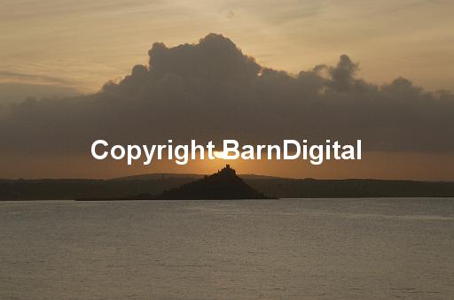 St Michael's Mount: Benedictine priory and castle. The island and buildings are silhouetted against the rising sun and morning sky. Viewed across Mounts Bay from Penzance. Penzance, Cornwall, England, UK. 19 September 2006.