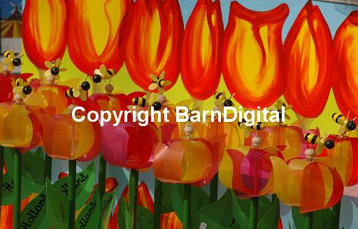 Brightly coloured tulip-shaped toy windmills with bees. Keukenhof Gardens, Holland. 25 April 2006