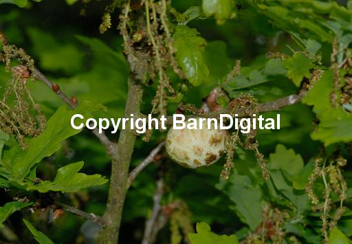 Oak apple galls on the stem of Pedunculate or Common Oak (Quercus robur). These are probably caused by the sexual generation lava of the gall wasp Biorhiza pallida. Bedgebury Forest, Kent, UK. 14 May 2006