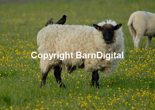 An adult and a juvenile starling (Sturnus vulgaris) sit on the back of a sheep in field of buttercups. Cuckmere Haven, Sussex, UK. 4 June 2006