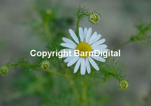 White and yellow flower of a wild chamomile. Bedgebury Forest, Kent, UK. 13 July 2006