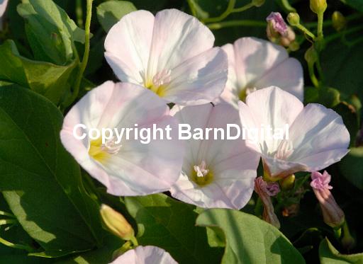 Flowers of Lesser Bindweed (Convolvulus arvensis). These flowers are very white, they are usualy more pink. Pegwell Bay, Ramsgate, Kent. 19 July 2006.