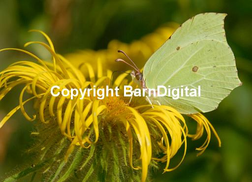 A male Brimstone Butterfly (Gonepteryx rhamni) feeds on a yellow Inula hookeri flowerThe proboscis is clearly visible sucking nectar from the flower. Bedgebury Forest, Kent, UK. 25 July 2004