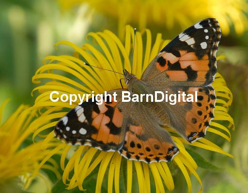 A Painted Lady Butterfly (Vanessa cardui) with wings open feeds on a yellow Inula hookeri flower.The proboscis is clearly visible sucking nectar from the flower. Bedgebury Forest, Kent, UK. 25 July 2004