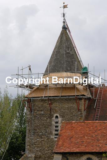 The spire of the Norman church of St Peter and St Paul Peasmarsh There is scaffolding round the tower and the shingles on the spire are being replaced the new light shingles can clearly be seen Peasmarsh Sussex UK. Peasmarsh, Sussex, UK. 02 August 2006.
