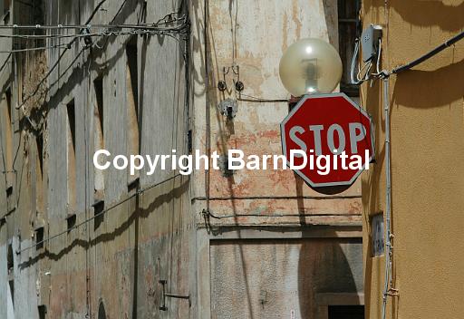 town city signs signage stop street wall plaster stuccco warning sign street furniture wire cable light red travel Italy Europe BarnDigital Barn Digital Michael Grant