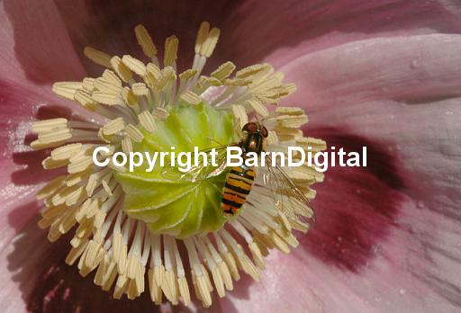 Papaver somniferum pink poppy family papaveraceae plant botany flower pollen blossom anther filament stigma style pistil petal male female seed pollen pollination nectar black yellow orange mimic Batesian mimicry feed Syrphidae Diptera true fly hover insect insecta compound eye science nature wildlife wild life closeup close up BarnDigital Barn Digital Michael Grant