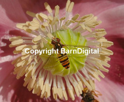 Papaver somniferum pink poppy family papaveraceae plant botany flower pollen blossom anther filament stigma style pistil petal male female seed pollen pollination nectar black yellow orange mimic Batesian mimicry feed Syrphidae Diptera true fly hover insect insecta compound eye science nature wildlife wild life closeup close up BarnDigital Barn Digital Michael Grant