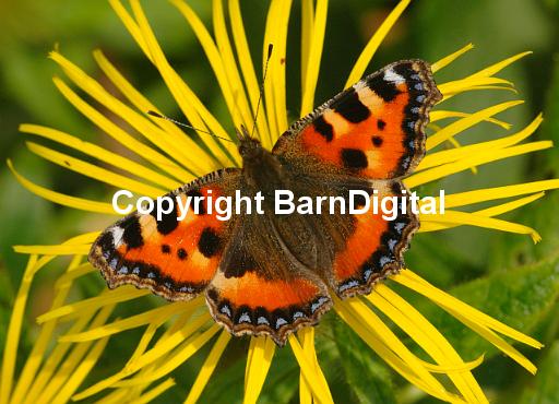 butterfly nectar pollen pollenation colour fly flight flower Lepidoptera Nymphalidae insect insecta proboscis scale compound eye bright summer daisy family compositae yellow red science nature wildlife wild life closeup close up BarnDigital Barn Digital Michael Grant