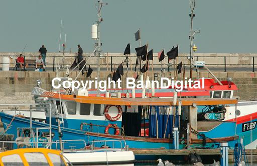 Fishing boat and equipment with black marker flags. Ramsgate harbour. Ramsgate, Kent, UK. 09 September 2005
