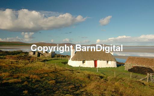 fuel sustainable black house building construction tradition house farm croft stone thatch white black house beach sea shore mud flats salt flats sand machair subsistance grazing sheep field hay grass Atlantic Ocean Outer Hebrides Western Isles island travel BarnDigital Barn Digital Michael Grant