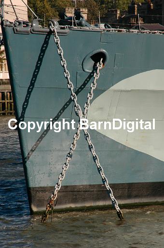 x battleship grey camouflage paint moor anchor chain ship battleship warship warfare retired redundant museum naval vessel navy sea marine maritime heritage London River Thames Michael Grant BarnDigital Barn Digital