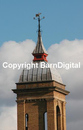 Brick tower at Cannon Street Station with leaded roof and weather vane. The station is in the heart of London's financial district on the north bank of the River Thames. It was built for the South Eastern Railway in 1867 by Sir John Hawkshaw. The station was roofed without internal supports but only the brick towers and the immense brick walls remain. City of London, UK. 04 November 2005.