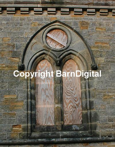 Sandstone derelict disrepair unused unwanted melancholy deconsecrated plywood church decoration stone gothic construction building architecture relegion Christianity Michael Grant BarnDigital Barn Digital