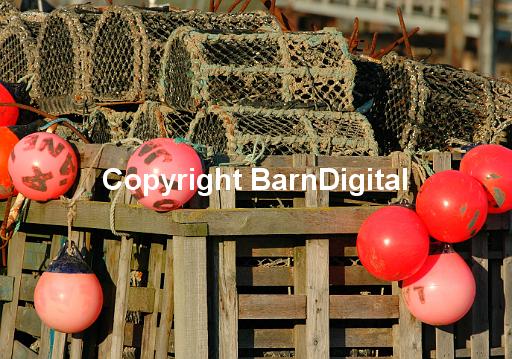 Crab pots and buoys on the harbour side. River Ouse. Newhaven, Sussex. UK. 19 November 2005.