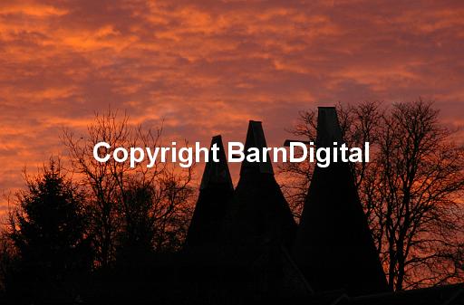 twilight sunset sundown sun sky set pink orange nightfall evening dusk colour color close of day UK rural Great Britain England countryside Country red peg tile oast Kent house hop hood dry cowl construction building brick beer architecture agriculture agricultural MIchaelGrantImages Michael Grant BarnDigital Barn Digital